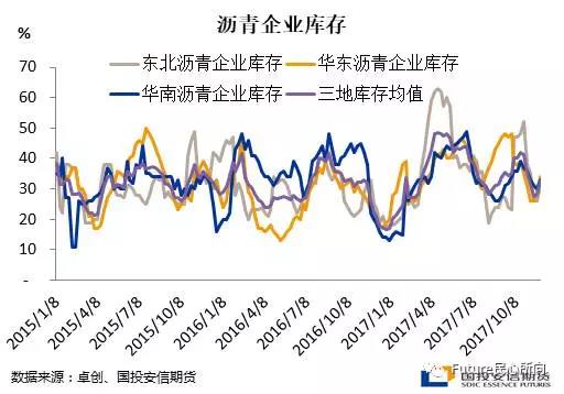 由于9、10月份环保因素压制着下游道路施工,因此,10月份下旬随着环保结束及天气转好,下游需求集中释放。此外,三季度末四季度初,尽管下游需求被压制,但是炼厂及时调节装置,因此,当需求集中释放时,炼厂库存不断下降,这为炼厂持续提价提供基本条件。现货价格不断上涨带动期货价格振荡上行,尽管11月15日受商品集体暴跌的拖累而大幅下跌,但是随后很快收复失地。