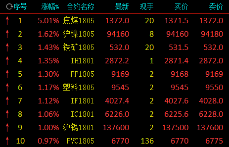 截止中午收盘,焦煤涨5.01%,沪镍涨1.62%,铁矿涨1.43%;跌幅方面,热卷跌1.83%,鸡蛋跌1.52%,螺纹跌1.40%。