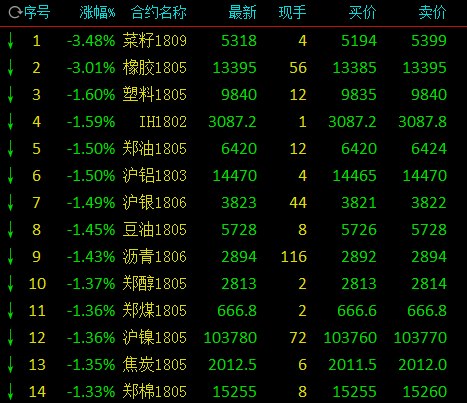 截至收盘,橡胶跌3.01%,塑料跌1.6%,郑油跌1.5%,沪铝跌1.5%,豆油跌1.45%,沥青跌1.43%,甲醇跌1.37%,动力煤跌1.36%,沪镍跌1.36%,焦炭跌1.35%,棉花跌1.33%。涨幅方面,菜粕涨0.34%,沪锡涨0.27%,豆粕涨0.22%。