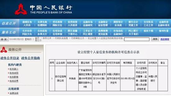 2月22日,央行披露了首张设立经营个人征信业务的机构许可信息公示表。公示表显示,百行征信有限公司(下称百行征信)申请设立个人征信机构已获得许可。