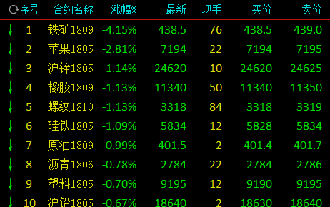 截止午后收盘,豆粕涨2.16%,豆二涨2.09%,豆一涨1.80%;跌幅方面,铁矿石跌4.15 %,苹果跌2.81%,沪锌跌1.14%。