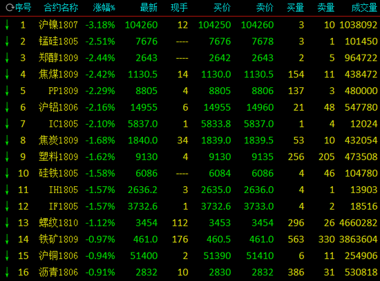 截至收盘,沪镍跌3.18%,锰硅跌2.51%,甲醇跌2.44%,焦煤跌2.42%,PP跌2.29%,沪铝跌2.16%,焦炭跌1.68%,塑料跌1.62%。涨幅方面,淀粉涨0.8%,郑油涨0.74%。