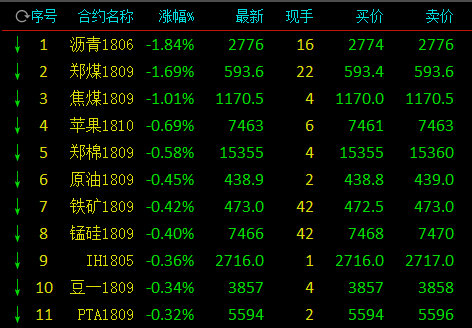 4月25日讯,周三商品期货市场多数下跌,截至收盘,沥青跌逾2%,郑煤、铁矿、焦煤、沪锌跌逾1%,郑醇、鸡蛋、沪铅、原油、玻璃、锰硅、热卷、沪锡、玉米、沪银、焦炭、沪铝、沪镍、沪金等下跌。硅铁领涨,涨2.7%;白糖、塑料、菜粕、橡胶、螺纹、沪铜等上涨。