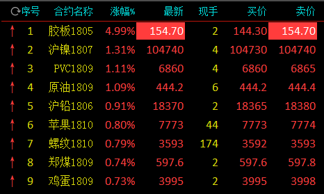 截止下午收盘,胶板涨停,沪镍涨1.31%,PVC涨1.11%,原油涨1.09%,沪铅涨0.91%,苹果涨0.80%,螺纹涨0.79%,郑煤涨0.74%,鸡蛋涨0.73%;跌幅方面,锰硅跌2.18%,橡胶跌1.66%,铁矿跌1.29%,焦炭跌1.17%,焦煤跌1.15%,豆一跌1.07%,豆二跌1.03%,白糖跌0.91%。