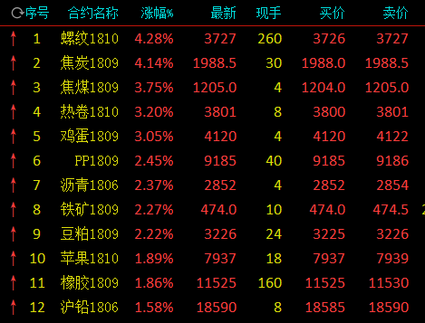 截止收盘,螺纹涨4.28%,焦炭涨4.14%,焦煤涨3.75%,热卷涨3.2%,鸡蛋涨3.05%,pp涨2.45%,沥青涨2.37%,铁矿涨2.27%,豆粕涨2.22%;跌幅方面,菜籽跌1.22%,锰硅跌1.13%,白糖跌1.12%,沪银跌0.82%,沪铜跌0.81%,沪铝跌0.31%。
