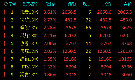 截止下午收盘,焦炭涨3.61%,铁矿石涨2.77%,螺纹钢涨2.28%,动力煤涨2.21%,热卷涨2.06%,焦煤涨2.02%,沪铅涨1.35%,PTA涨1.33%;跌幅方面,郑麦跌1.41%,菜粕跌1.37%,豆二跌1.04%,豆粕跌0.97%。