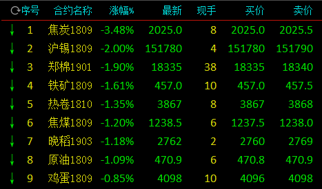 截止下午收盘,焦炭跌3.48%,沪锡跌2.00%,棉花跌1.90%,铁矿石跌1.61%,热卷跌1.35%,焦煤跌1.20%,晚稻跌1.18%,原油跌1.09%;涨幅方面,郑麦涨2.21%,沥青涨1.40%,豆一涨1.08%,PVC涨0.88%。