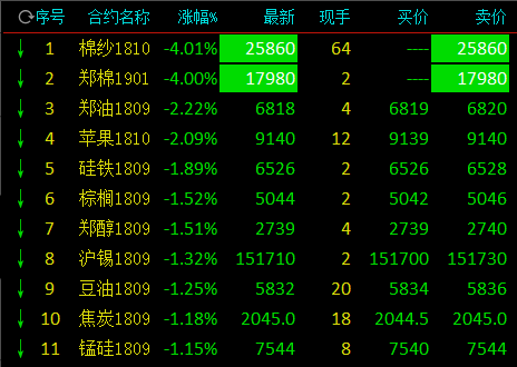 截止下午收盘,棉纱、棉花跌停,郑油跌2.22%,苹果跌2.09%,硅铁跌1.89%,棕榈跌1.52%,甲醇跌1.51%,沪锡跌1. 32%,豆油跌1.25%,焦炭跌1.18%,锰硅跌1.15%;涨幅方面,沪铅涨3.57%,铁矿石涨1.74%,pvc涨1.16%,沪铜涨0.81%。