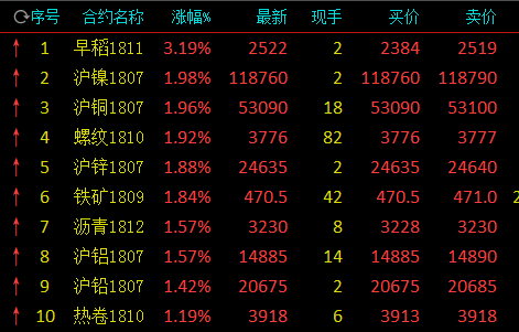 截止下午收盘,早稻涨3.19%,沪镍涨1.98%,沪铜涨1.96%,螺纹涨1.92%,沪锌涨1.88%,铁矿石涨1.84%,沥青涨1.57%,沪铝涨1.57%,沪铅涨1.42%,热卷涨1.19%;跌幅方面,棉花跌3.21%,棉纱跌1.43%,豆一跌1.32%,白糖跌1.12%,晚稻跌0.94%。