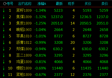 6月11日消息,商品期货早盘走势分化,黑色系下挫,双焦跌逾1%,动力煤跌近1%,螺纹、热卷飘绿,但铁矿石涨逾1%;农产品跌多涨少,菜籽跌逾1%领跌商品期货,晚稻、苹果均跌逾1%,大豆、鸡蛋跌近1%,棉花涨逾1%;有色金属涨跌互现,铅、锌、铜上行,锡、镍、铝下跌;化工品波动不大,略显分化,沥青跌近1%,PP涨近1%。