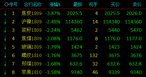截止下午收盘,焦炭跌3.87%,沪镍跌2.49%,菜籽跌2.24%,焦煤跌2.08%,玻璃跌1.79%,螺纹钢跌1.76%,动力煤跌1.68%,苹果跌1.58%,棉花跌1.46%,热卷跌1.37%,沪铝跌1.06%,沪锌跌1.05%;涨幅方面,硅铁涨3.69%,豆粕涨2.17%,胶板涨1.73%,菜粕涨1.67%,沪铅涨1.22%,塑料涨1.06%,豆二涨1.06%。