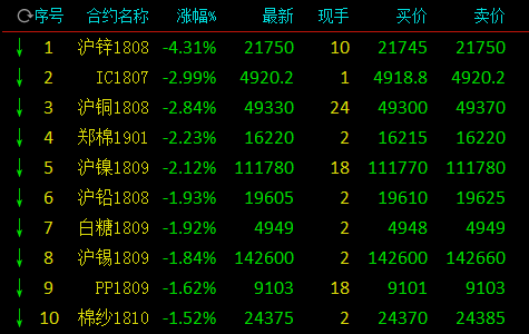 截止下午收盘,沪锌跌4.31%,沪铜跌2.84%,棉花跌2.23%,沪镍跌2.12%,沪铅跌1.93%,白糖跌1.92%,沪锡跌1.84%,PP跌1.62%,棉纱跌1.52%,动力煤跌1.40%;涨幅方面,甲醇涨1.19%,沥青涨0.87%,豆一涨0.60%。