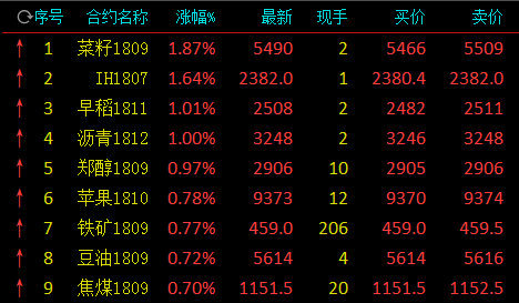 截止下午收盘,菜籽涨1.87%,早稻涨1.01%,沥青涨1.00%,苹果涨0.78%,铁矿石涨0.77%,豆油涨0.72%,焦煤涨0.70%;跌幅方面,动力煤跌1.38%,沪铜跌1.05%,豆一跌1.01%,白糖跌0.90%,PP跌0.80%,PVC跌0.73%,豆二跌0.58%。