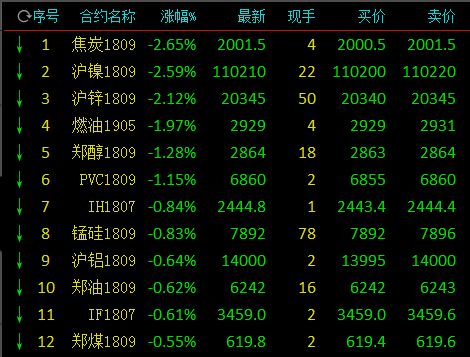 截止下午收盘,焦炭跌2.65%,沪镍跌2.59%,沪锌跌2.12%,燃油跌1.97%,甲醇跌1.28%,PVC跌1.15%;涨幅方面,晚稻涨2.03%,淀粉涨1.65%,鸡蛋涨1.01%,硅铁涨0.98%。