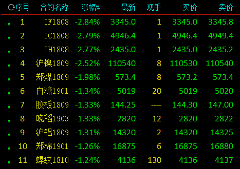 截止下午收盘,沪镍跌2.52%,动力煤跌1.98%,白糖跌1.34%,沪铝跌1.31%,棉花跌1.26%,螺纹钢跌1.24%,沪铜跌1.18%,热卷跌1.14%,沪铅跌1.00%,菜粕跌1.00%;涨幅方面,PTA涨4.59%,焦炭涨2.20%,硅铁涨2.16%,甲醇涨2.03%,PP涨1.55%,塑料涨1.38%,鸡蛋涨1.26%。