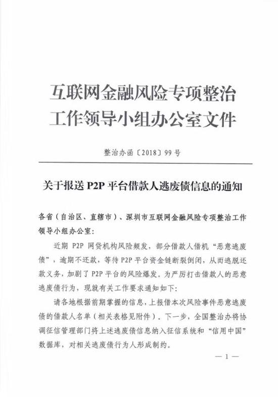 通知称,近期部分P2P平台借款人出现“恶意逃废债”,逾期不还款,等待P2P平台资金链断裂倒闭,从而逃脱还款义务等行为,加剧了P2P平台的风险爆发。为严厉打击借款人的恶意速废债行为,请各地上报借本次风险事件恶意逃废债的借款人名单。