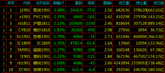 期货跌幅排名:焦炭跌3.08%,PVC(6860, -165.00, -2.35%)跌2.35%,沪镍(107600, -2330.00,-2.12%)跌2.12%,棉纱跌1.82%,热卷(4064, -74.00, -1.79%)跌1.79%,锰硅(8380, -108.00,-1.27%)跌1.27%,塑料(9380, -115.00, -1.21%)跌1.21%。