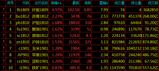 期货涨幅排名:沥青涨2.23%,沪铅(18810, 310.00, 1.68%)涨1.68%,燃油涨1.62%,原油涨1.61%,沪锌涨1.53%,玉米涨1.28%,苹果涨1.24%。