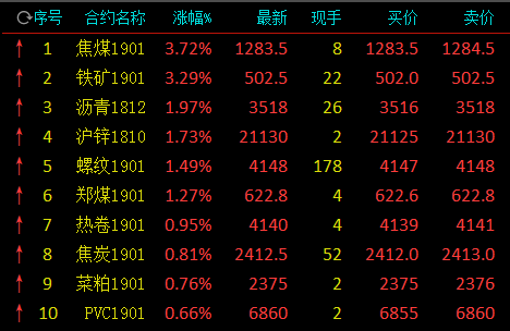 截止下午收盘,焦煤涨3.72%,铁矿石涨3.29%,沥青涨1.97%,沪锌涨1.73%,螺纹涨1.49%,动力煤涨1.27%;跌幅方面,晚稻跌2.48%,燃油跌1.56%,锰硅(8274, -104.00, -1.24%)跌1.24%,原油跌1.08%,玻璃跌1.08%。