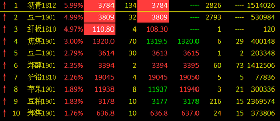 9月10日,国内期市收盘多数飘红, 大豆(3809, 181.00, 4.99%)、沥青(3784, 214.00,5.99%)尾盘涨停。截至下午收盘,焦煤(1320, 38.00, 2.96%)涨3%,甲醇(3394, 78.00, 2.35%)、沪铅(19045, 420.00, 2.26%)涨超2%,豆粕(3178, 57.00, 1.83%)、动力煤(637, 11.00, 1.76%)、螺纹钢(4284, 74.00, 1.76%)、原油等涨超1%,白糖(4865, -92.00, -1.86%)跌近2%,铁矿(498, -3.50,-0.70%)石跌近1%。